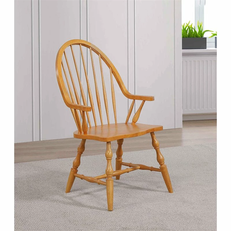 Windsor chairs are famous for their uncomplicated and universal design. Transform a kitchen corner into a cozy breakfast nook with these open and airy spindle back chairs. The seat has a saddle shape to assure maximum comfort with arms that give just the right support, yet slightly short, enabling you to sit down and get up with ease. Constructed from solid eco-friendly Malaysian oak, this farmhouse chic armchair is truly timeless and looks fantastic when paired with other dining room furniture pieces in the Sunset Oak Collection.